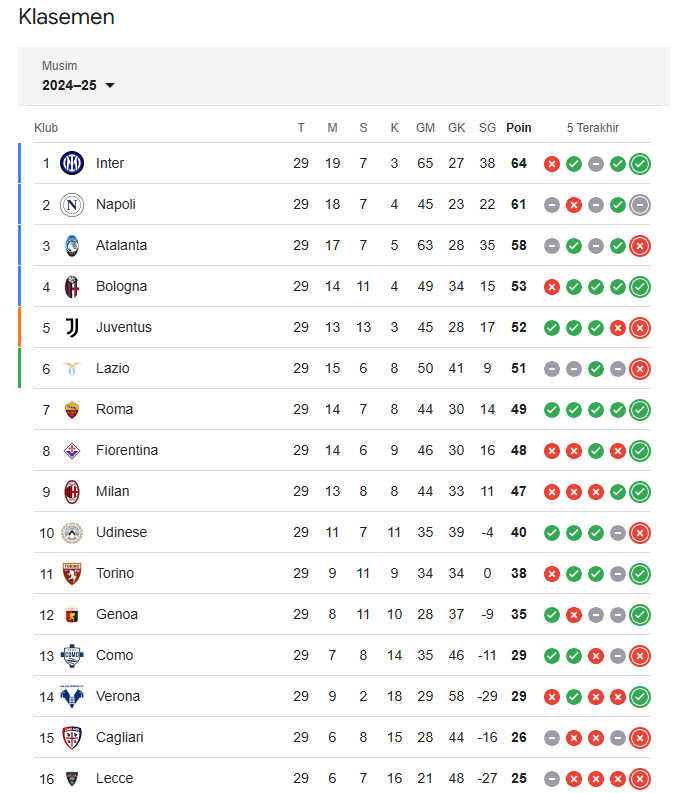 Dengan kemenangan ini, Inter Milan mengumpulkan 64 poin dan semakin kokoh di puncak klasemen Serie A, sementara Atalanta tetap di posisi ketiga dengan 58 poin.